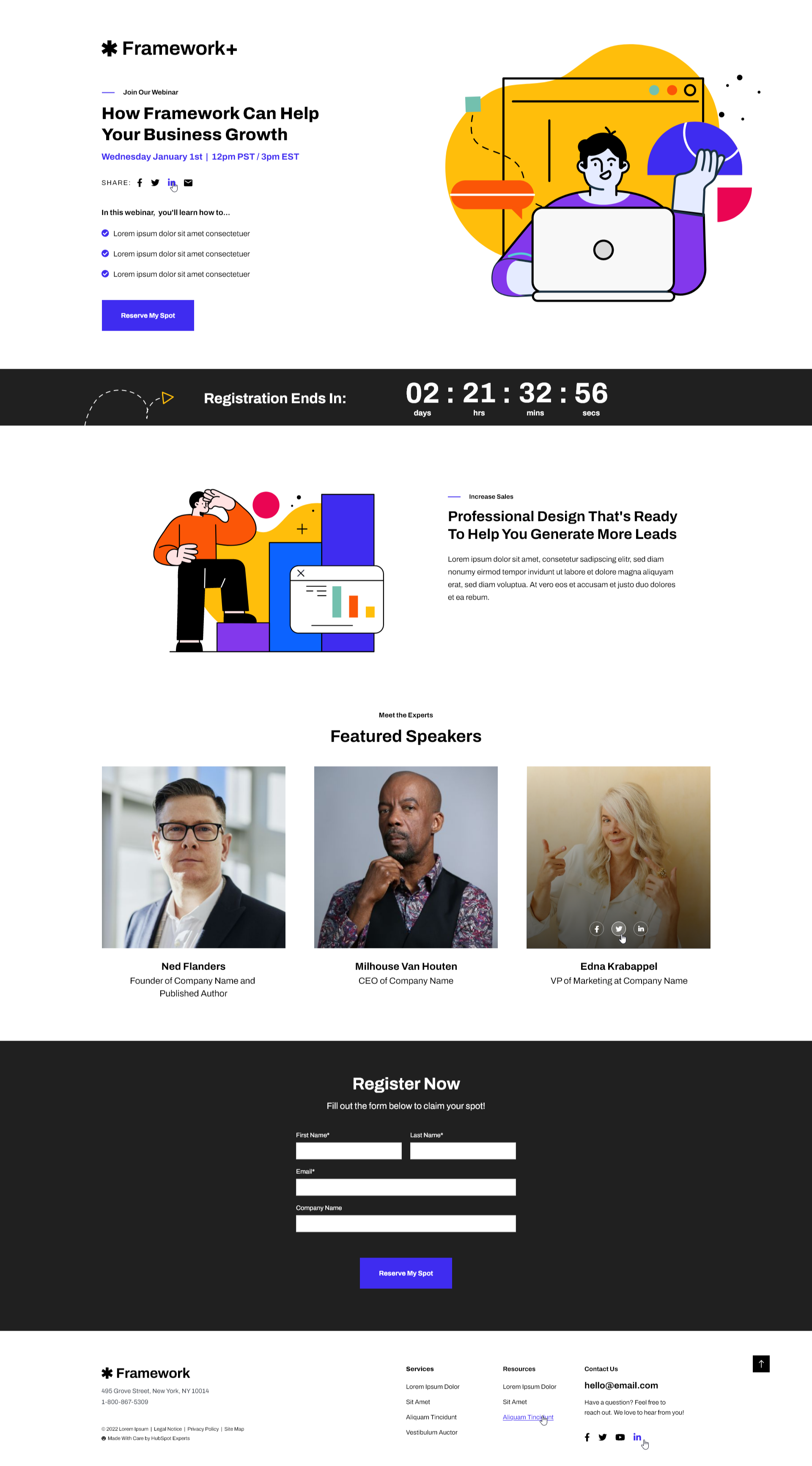 Promote your events, webinars, and downloadable content with dedicated landing page templates. Framework+ includes purpose-built eBook, webinar, and event templates with registration forms, countdown timers, and speaker sections to maximize conversions.