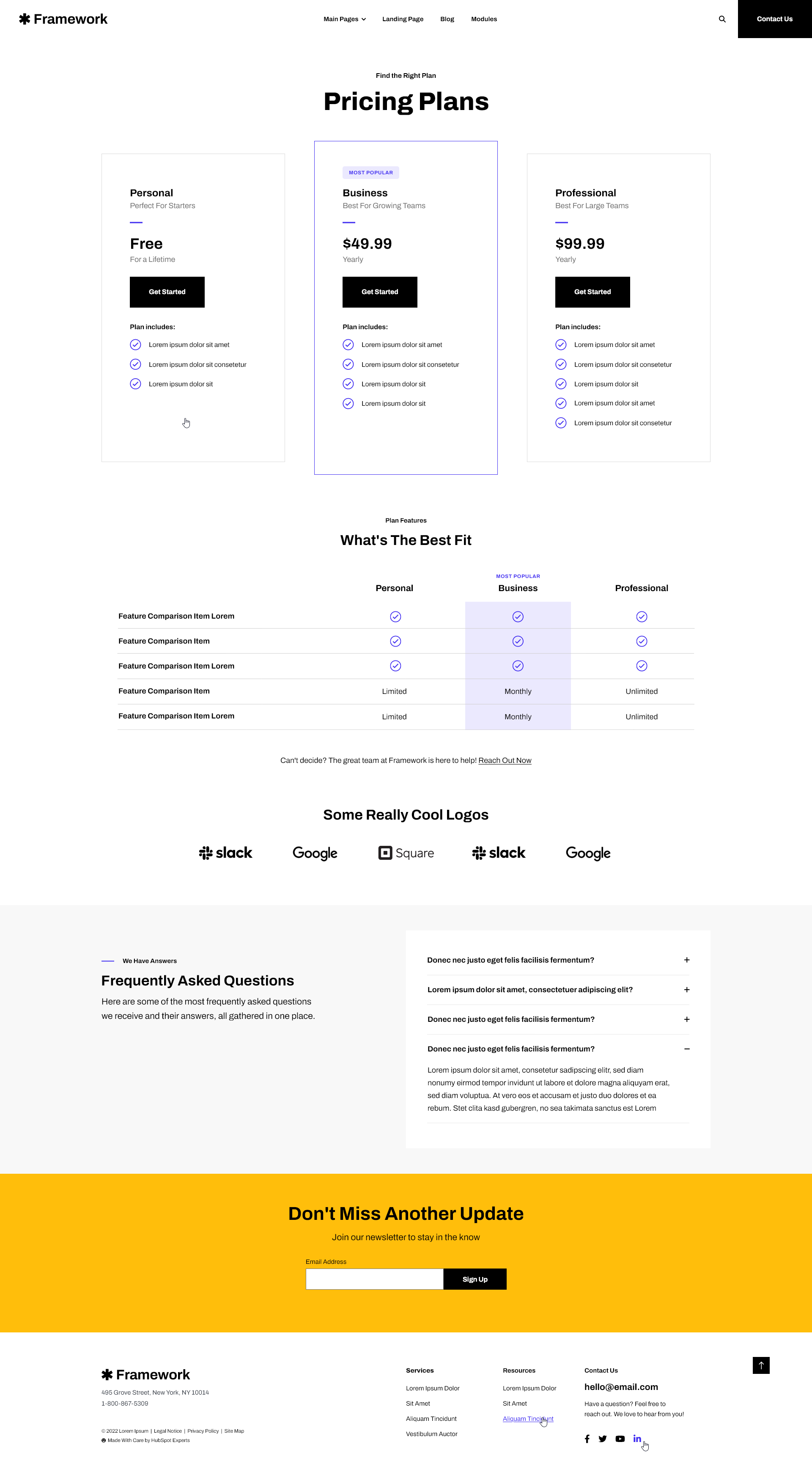 When selling products or services, having transparent, predictable pricing is essential. Framework+'s Complex Pricing Comparison module lets you display tiered pricing with feature comparisons, checkmarks, highlights, and call-to-action buttons.