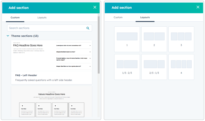The “Layouts” tab lets you select from predefined column layouts to add a blank section.