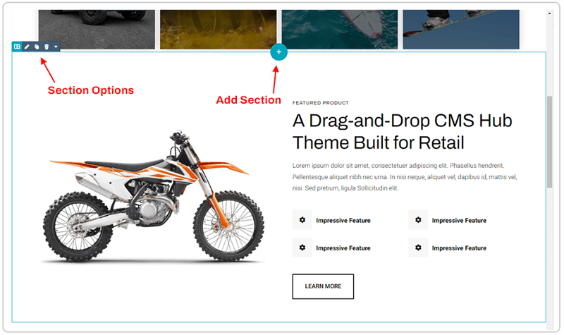 Sections are the top most component of a drag-and-drop area that wraps around a single row of columns.