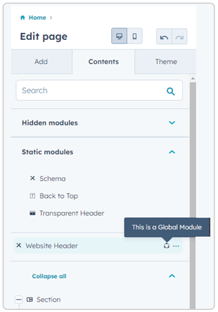 Hovering over global content in the preview pane will highlight it in orange. The Contents tab of the left-hand sidebar will separate them from the rest of the modules with a circular icon to the right of their name. Clicking on a global content area will open a dialog with a button that will redirect you to a separate page editor for editing its content.