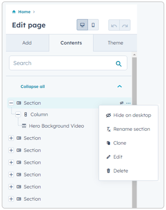 You can navigate to the Contents tab in the left-hand sidebar to get an overview of all the sections on the page. Hovering over a section in the list will give you the same setting options as in the preview pane, with the addition of “Rename Section,” allowing you to name a section to organize the Contents tab better. You can collapse and expand each or all sections to view the columns and modules inside them.